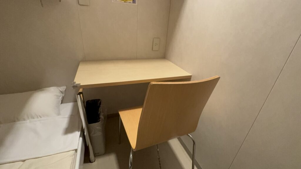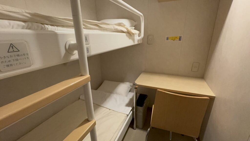 個室の一番低ランクの二等客室Aはベッドとミニデスクがついた小さな部屋で窓はありません。